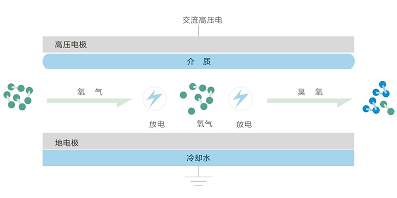 臭氧氣體本身不穩(wěn)定,因此在使用時必須現(xiàn)場制備;臭氧分解的產物是氧氣,因此臭氧是一種環(huán)境友好的氧化劑;臭氧產生通過介質阻擋放電法產生,介質阻擋放電法是把絕緣介質放入到放電空間的一種氣體放電方式,在兩平行高壓電極之間隔以絕緣介電體,而且放電間隙要保持一定的距離,當接入高壓電源時,會產生交變高壓電場和磁場,當干燥空氣或氧氣通過放電通道時,氧分子被高能電子激發(fā)而獲得能量,并相互碰撞形成臭氧分子。