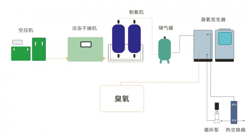 富氧源臭氧系統(tǒng)主要包括:空氣壓縮機(jī)、兩級(jí)除油、除水過濾器、氣體顆粒過濾器;冷干機(jī)、制氧機(jī)、儲(chǔ)氣罐、臭氧發(fā)生器主機(jī);控制閥門和檢測儀表;臭氧和尾氣破壞系統(tǒng)組成。
